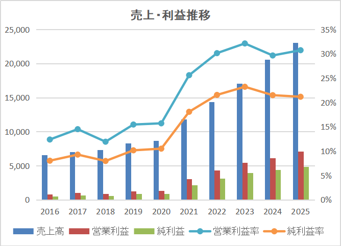 営業利益率30%超、ROE30%超は国内トップクラス。