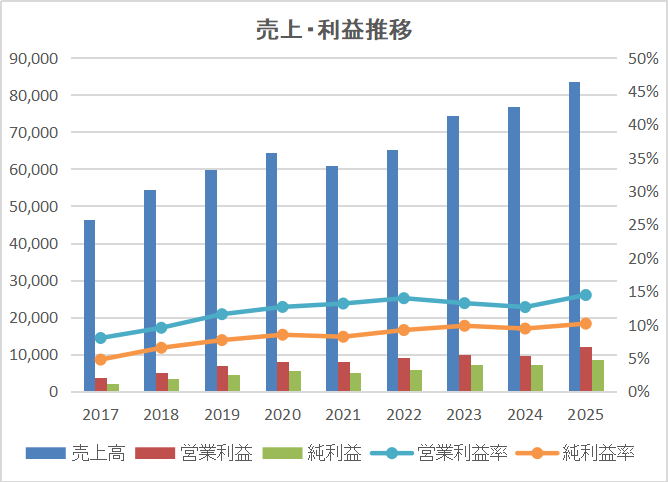 - ROE(自己資本利益率):直近5年間は常に20%を上回る水準(2025年3月期は24.0%)を維持。資本を効率的に活用して利益を生む力は、依然として日本企業トップクラスです。