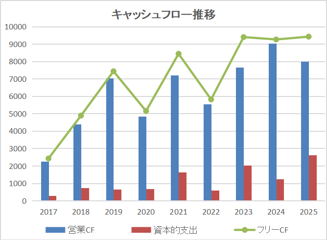 - フリーキャッシュフロー:稼いだキャッシュの範囲内で投資を行い、余剰資金を株主還元に回すという健全なサイクルが確立されています。